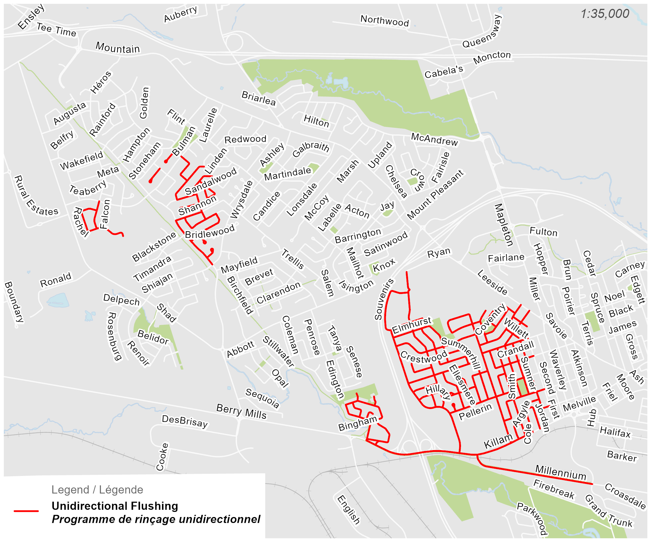 City of Moncton My Services Water & Wastewater Watermain Flushing Program Watermain Flushing Program We have started our annual watermain flushing program. Flushing will take place Monday to Friday from 8 a.m. to 8 p.m. in different areas of the city each week. The City’s annual watermain flushing program starts in April and is expected to be completed in late July. 506.853.3333info@moncton.ca Week of June 9 to June 13 Each Friday, the maps below will be updated to indicate where crews will be undertaking watermain flushing. Should your area be highlighted below, you may notice a slight discolouration and reduction in water pressure while crews are flushing in your immediate area (Monday to Friday, 8 a.m. to 8 p.m.). Your water service should not be interrupted. If you have no water pressure, please contact Public Works Dispatch at 506-853-3333 as soon as possible. How will I be affected? Flushing is generally conducted Monday to Friday between 8 a.m. and 8 p.m. While the hydrants are being flushed, customers in the immediate area of the flushing may experience discoloured water or a small drop in water pressure but water service should not be interrupted. We recommend avoiding doing loads of white laundry on these days between 8 a.m. and 8 p.m. We recommend checking around your neighbourhood for water in the roadway to see if crews are in your immediate area. Out of an abundance of caution, we recommend waiting until the following day to do laundry to avoid any discolouration. In the event that you have no water pressure, please notify Public Works 24/7 dispatch line at 506-853-3333 as soon as possible. Why do we flush pipes and fire hydrants? Flushing of pipes and fire hydrants is required to maintain water quality. The scouring effect of high velocity water helps to clean the interior of the pipes, flushing the accumulated sediments out of the system, removing stale water, and restoring chlorine residual. The City has an annual flushing program, which is carried out in the spring when there is extra water available. Why are we flushing? Since water mains are sized to allow adequate and safe flows for fire protection, water typically is moving through the underground pipes at less than 1 km/hr. This slow movement allows mineral deposits to accumulate in pipes over time. The build-up can restrict water flow in the pipes and contributes to corrosion and water colour problems. Periodic flushing removes the mineral deposits and is critical to maintaining water quality and the water system. Flushing progress and updates The City will have three crews in three different locations each week throughout the City. Each week, the map will be updated to advise residents if crews will be in their area the following week. Highlighted areas are scheduled to be flushed. Updates will be made on this webpage as well as via the City of Moncton’s social media channels. What if my water is discoloured? Should black or brown coloured water appear, do not be alarmed. It is recommended you do not use the water or do laundry. Run your faucets for a few minutes to make sure the water is clear and then resume normal water use. If water does not clear within a few hours or you have lost all water pressure, please notify our 24/7h Public Works Dispatch Line at 506-853-3333.