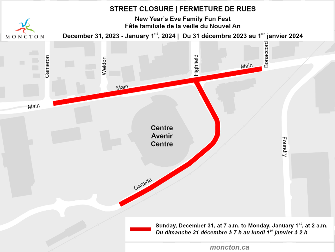 Street closure for the NYE Family Fun Fest Location: Main Street between Cameron Street and Bonaccord Street and Canada Street from the back of the Avenir Centre to Main StreetDate: Dec. 31, 2023, to Jan. 1, 2024Time: 7 a.m. on Dec. 31 to 2 a.m. on Jan. 1Details: The closure is to accommodate the NYE Family Fun Fest festivities downtown. Traffic impact: The above-named streets will be closed to traffic during this time. The Hyatt Hotel and Carrabba’s can be accessed by Canada Street via Vaughan Harvey. Noise by-law exemption: A noise by-law exemption has been granted to allow for the NYE Family Fun Fest festivities on Sunday, Dec. 31 and Monday, Jan. 1. Event details: New Year’s Eve Family Fun Fest