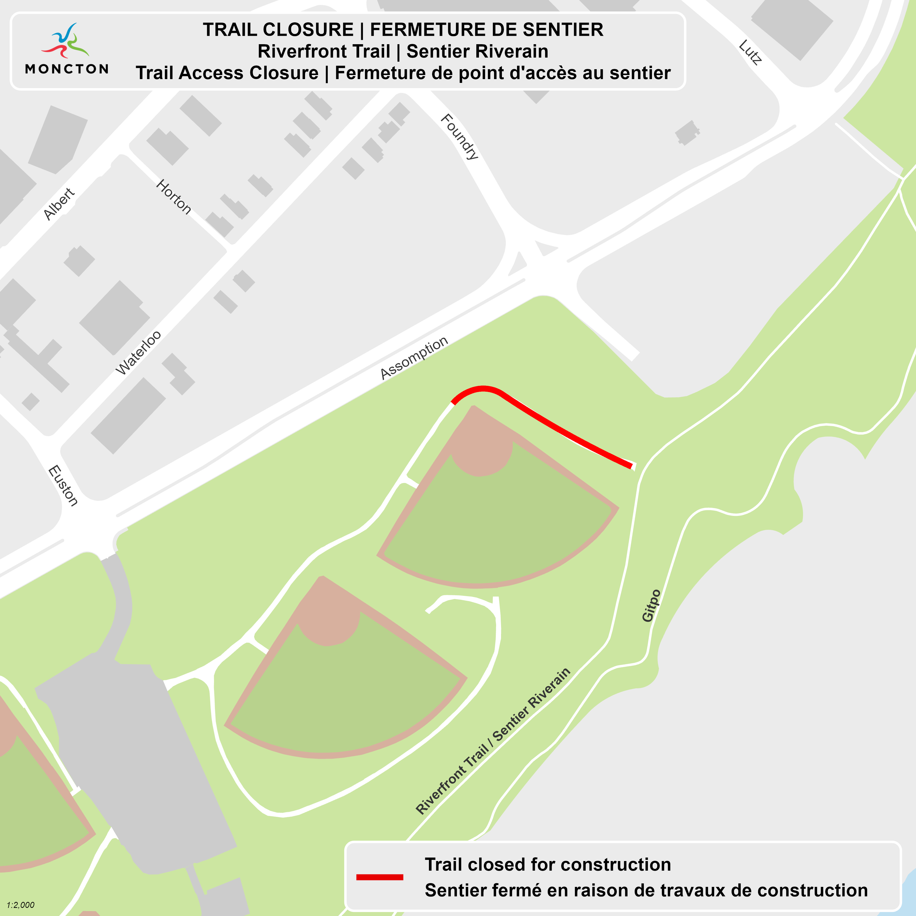 Trail Access Closure at Riverfront Park Location: Riverfront Trail at Hal Betts Field, near Foundry StreetDate: Tuesday, Aug. 5 until approximately Tuesday, Sept. 30, 2025Work details: Re-alignment of storm pipe and site servicing for new developmentTraffic impact: The trail access will remain closed throughout the duration of work. Trail closure signage will be in place. The Riverfront Trail will remain accessible via Euston Street and Lutz Street.