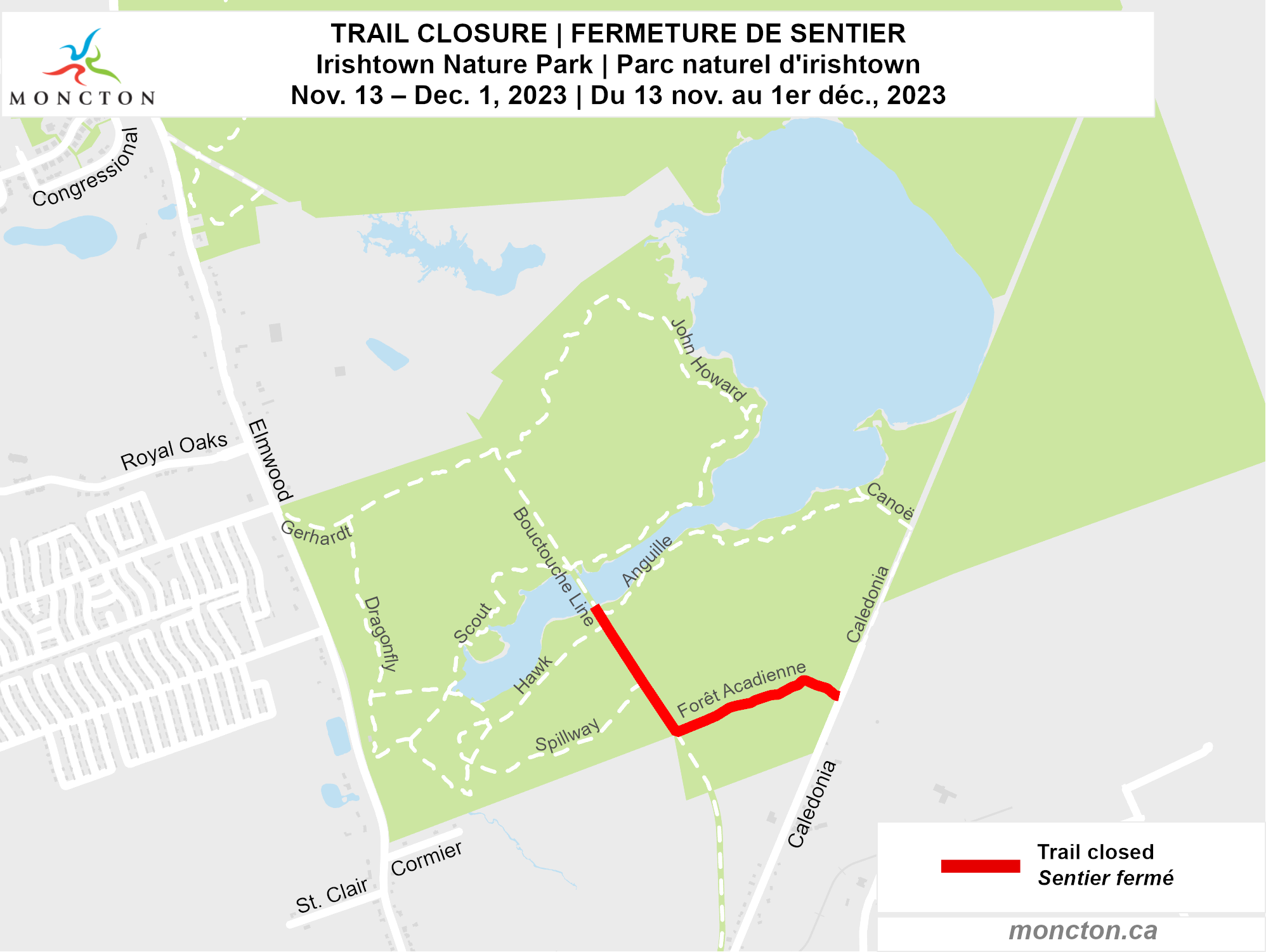 Trail Closures in Irishtown Park Location: Forêt Acadienne Trail – from Caledonia Road to Bouctouche Line TrailBouctouche Line Trail – from Forêt Acadienne Trail to the new bridge at the reservoirDate: Nov. 13 to Dec. 1Work details: Trail upgrades and installation of culverts.Traffic impact: Trails will be closed to pedestrians for the duration of this work.
