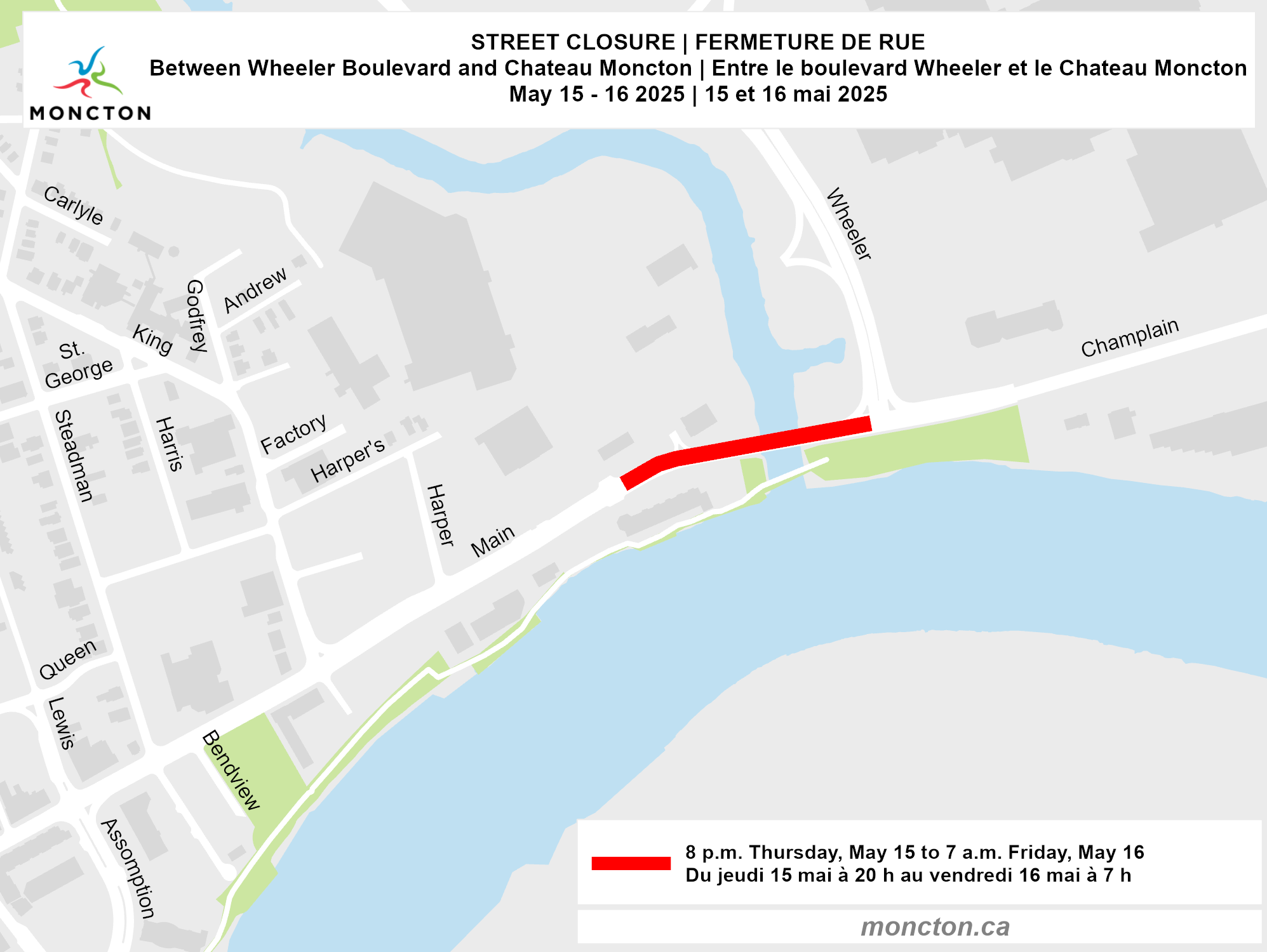 Fermeture de rue sur la rue Main Lieu : Entre le boulevard Wheeler et le Château MonctonDate : Du jeudi 15 mai à 20 h au vendredi 16 mai à 7 hDétails des travaux : Travaux de nuit pour la réfection du réseau d’aqueduc.Répercussions sur la circulation : Cette section de la rue sera entièrement fermée. Les intersections du boulevard Wheeler à la rue Main et du Chateau Moncton à la rue Main resteront accessibles.