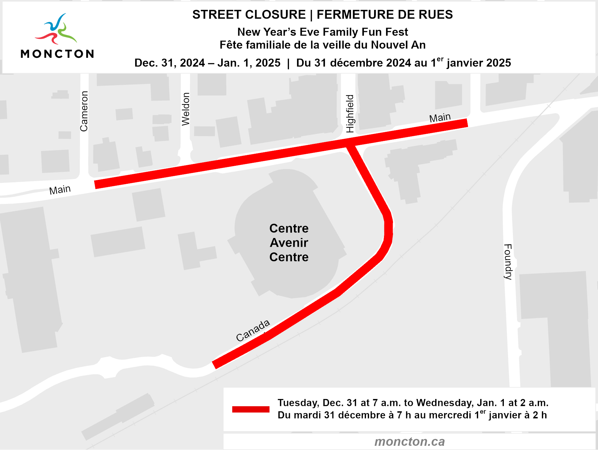 Fermeture de rues à l’occasion de la Fête familiale de la veille du Nouvel An Lieu : Rue Main, entre la rue Cameron et la rue Bonaccord, et rue Canada, entre l’arrière du Centre Avenir et la rue MainDate : 31 déc. 2024 au 1er janv. 2025Durée : 31 déc. à 7 h au 1er janv. à 2 hDétails : Les rues susmentionnées seront fermées pour la tenue des festivités de la Fête familiale du Nouvel An au centre-ville.Répercussions sur la circulation : Les rues susmentionnées seront fermées à la circulation pendant cette période. Il sera possible d’accéder à l’Hôtel Hyatt et au restaurant Carrabba’s par la rue Canada, à partir du boulevard Vaughan Harvey. Exemption à l’Arrêté concernant les bruits excessifs : Une exemption à l’Arrêté concernant les bruits excessifs a été accordée pour les festivités de la Fête familiale de la veille du Nouvel An, qui auront lieu le dimanche 31 décembre et le lundi 1er janvier.Détails de l’événement : Fête familiale de la veille du Nouvel An | Événements et festivals │ Moncton