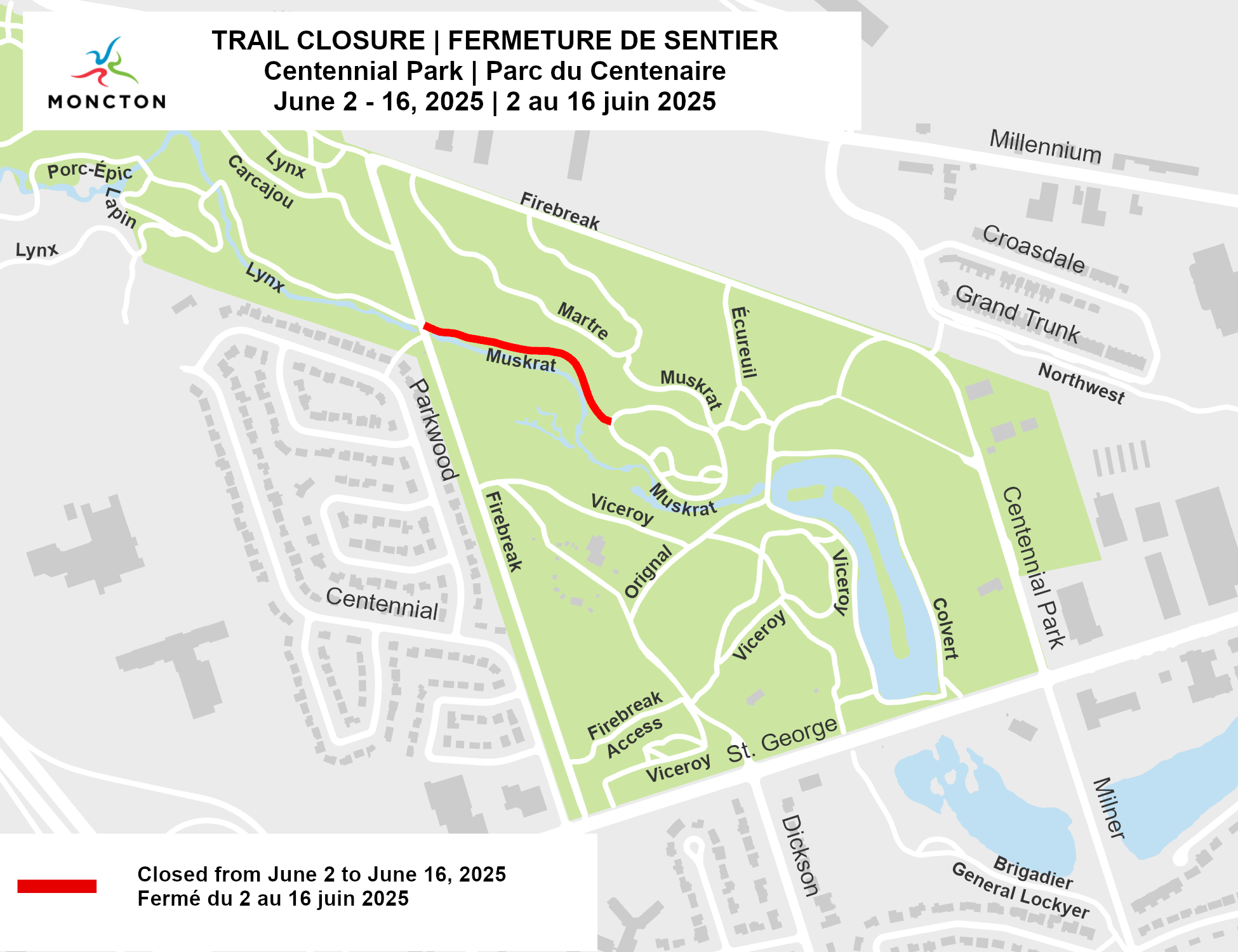 Fermeture d’une section du sentier dans le parc du Centenaire Lieu : Sentier MuskratDate : Du lundi 2 juin jusqu’au lundi 16 juin environDétails des travaux : Travaux de drainage et de resurfaçageRépercussions sur la circulation : Cette section du sentier sera fermée pendant la durée des travaux. Des panneaux indiqueront aux utilisateurs du sentier la déviation en place.