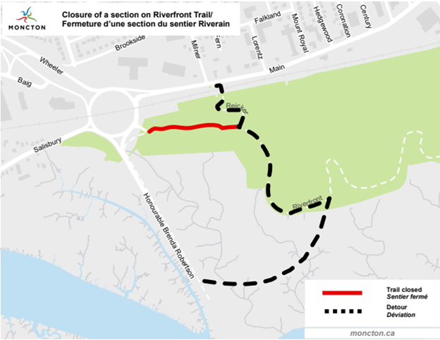 Fermeture d’une section du sentier Riverain Lieu : Sentier Riverain, à partir du sentier Reicker jusqu’au carrefour giratoire de la rue Main OuestDate : Fermé jusqu’à nouvel ordreDétails des travaux : Installation d’une nouvelle conduite d’égout sanitaire dans le carrefour giratoire de la rue Main Ouest.Répercussions sur la circulation : Cette section du sentier sera fermée pendant la durée des travaux. Des panneaux indiqueront aux utilisateurs du sentier la déviation en place.