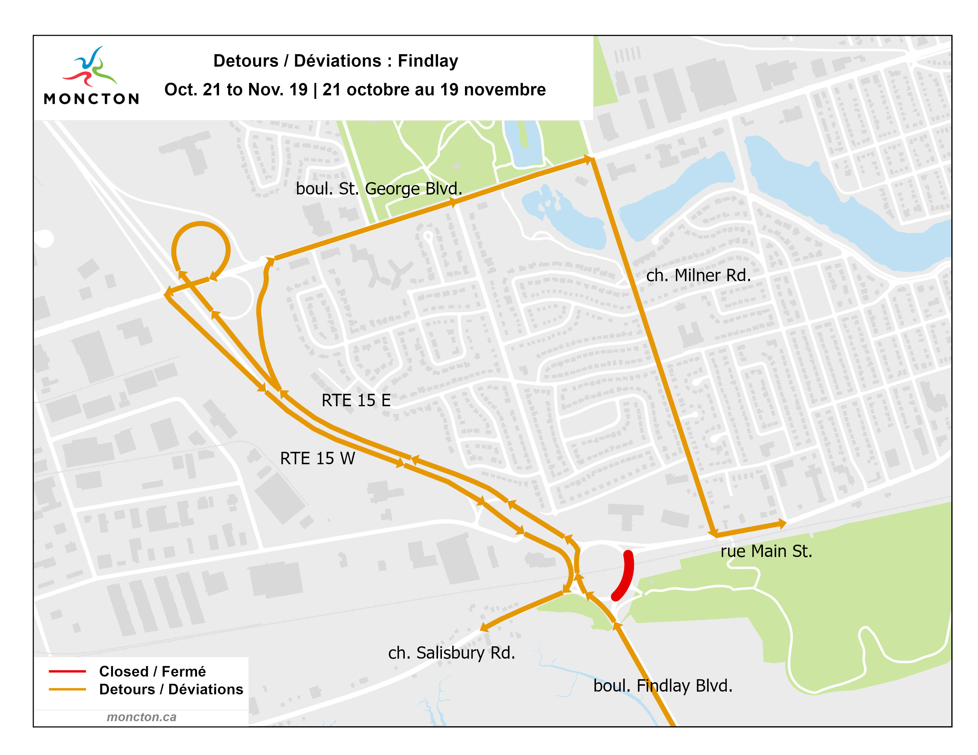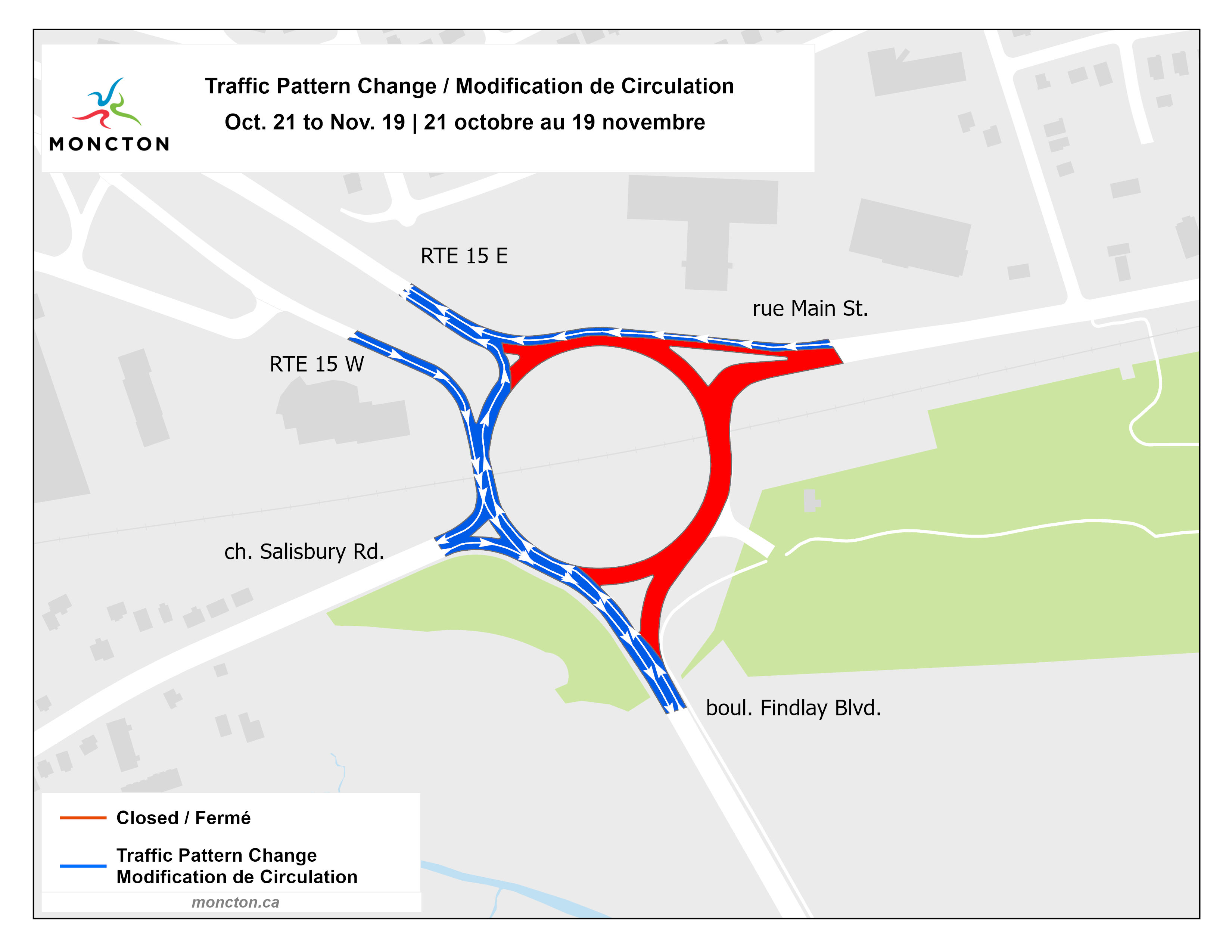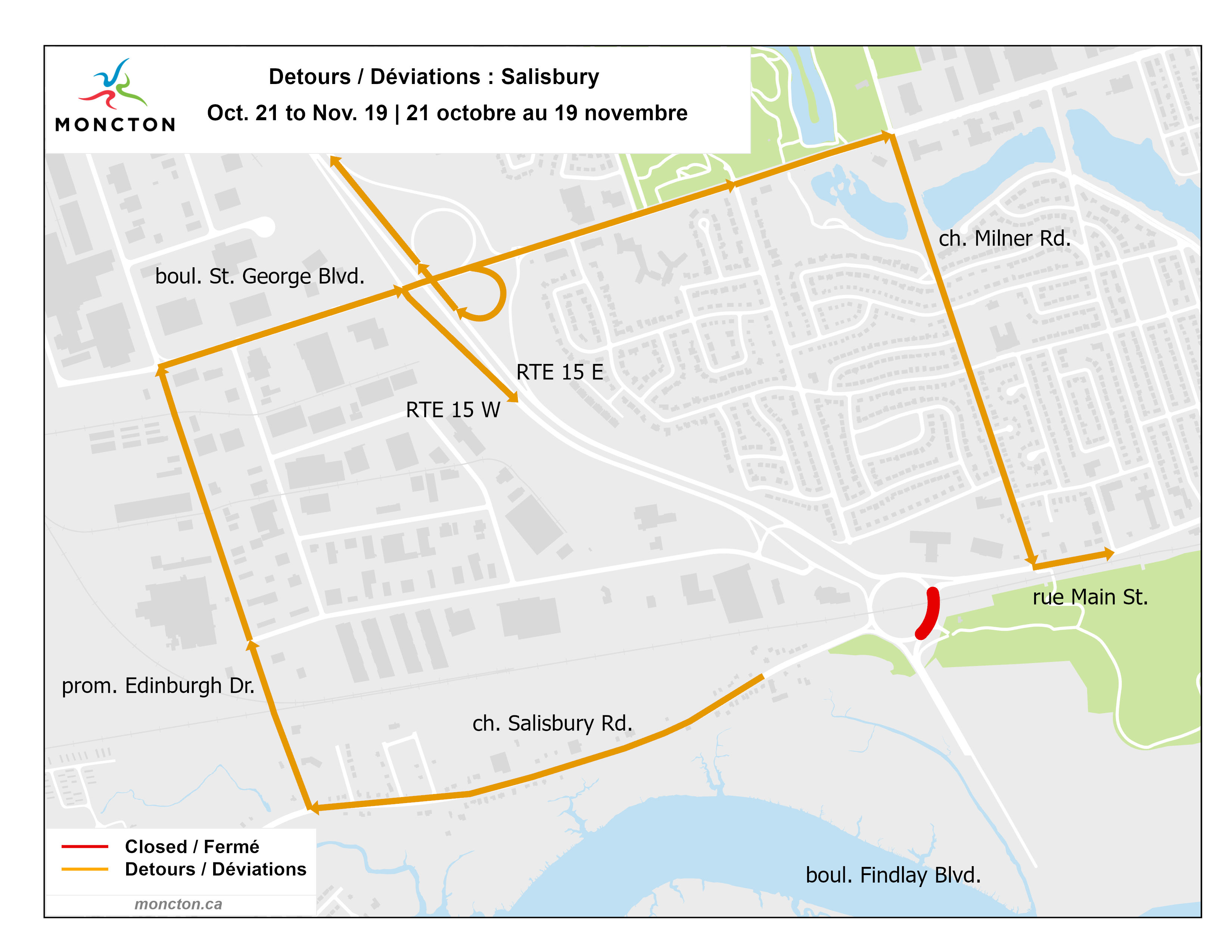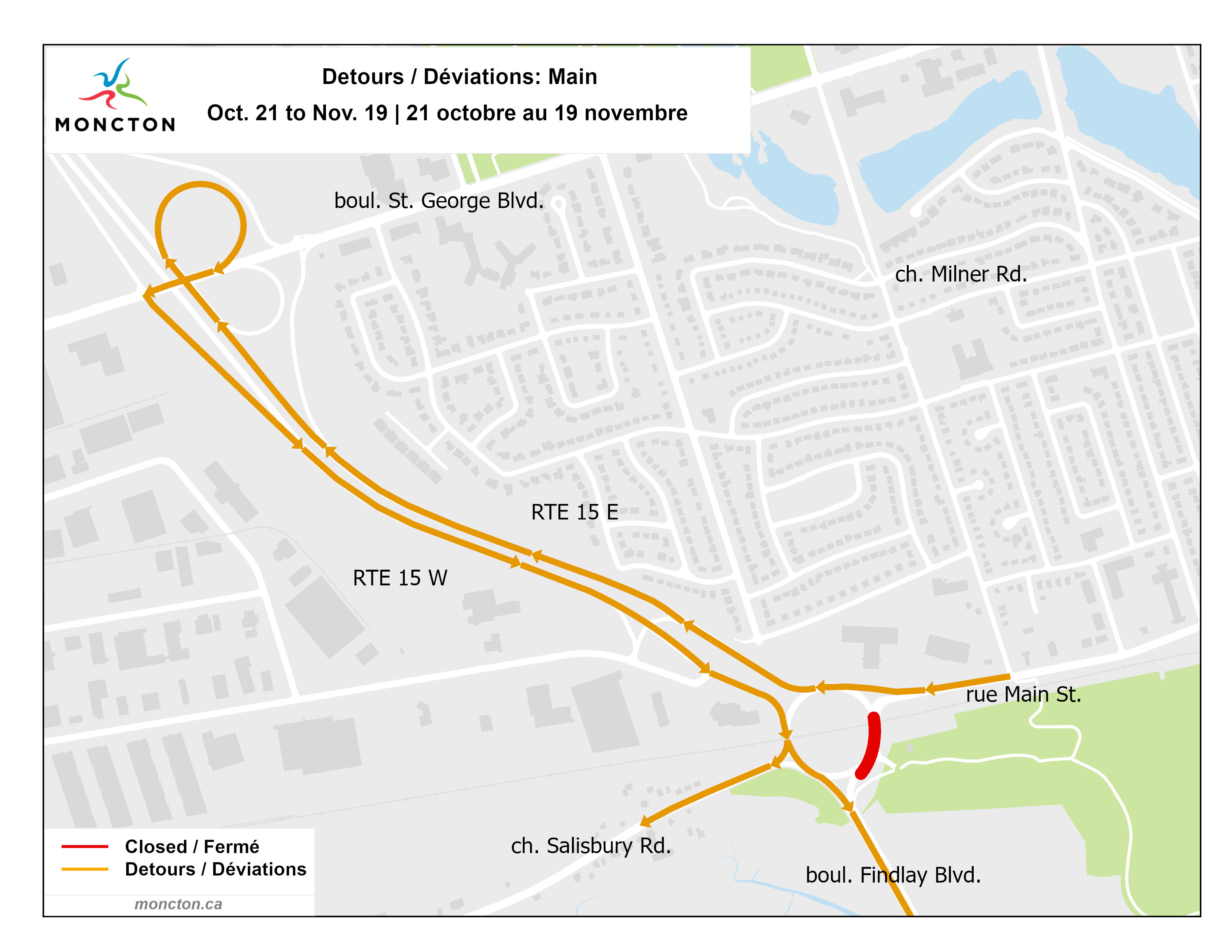 Fermeture partielle du carrefour giratoire de la rue Main Ouest Date : Du lundi 28 octobre au mardi 19 novembreDétails des travaux : Installation d’une nouvelle conduite d’égout sanitaireRépercussions sur la circulation : Plusieurs déviations et changements à la configuration de la circulation. Des panneaux de signalisation et des signaleurs dirigeront la circulation, qui pourrait être ralentie dans le secteur.Il ne sera pas possible d’accéder à la rue Main à partir du boulevard Findlay. La circulation sera déviée vers le boulevard St. George.Il ne sera pas possible d’accéder à la rue Main ou au boulevard Wheeler (route 15) à partir du chemin Salisbury. La circulation sera déviée vers la promenade Edinburgh.Il ne sera pas possible d’accéder à la rue Main à partir du boulevard Wheeler (route 15). La circulation sera déviée vers le boulevard St. George.Il ne sera pas possible d’accéder au boulevard Findlay ou au chemin Salisbury à partir de la rue Main. La circulation sera déviée vers le boulevard Wheeler (route 15).
