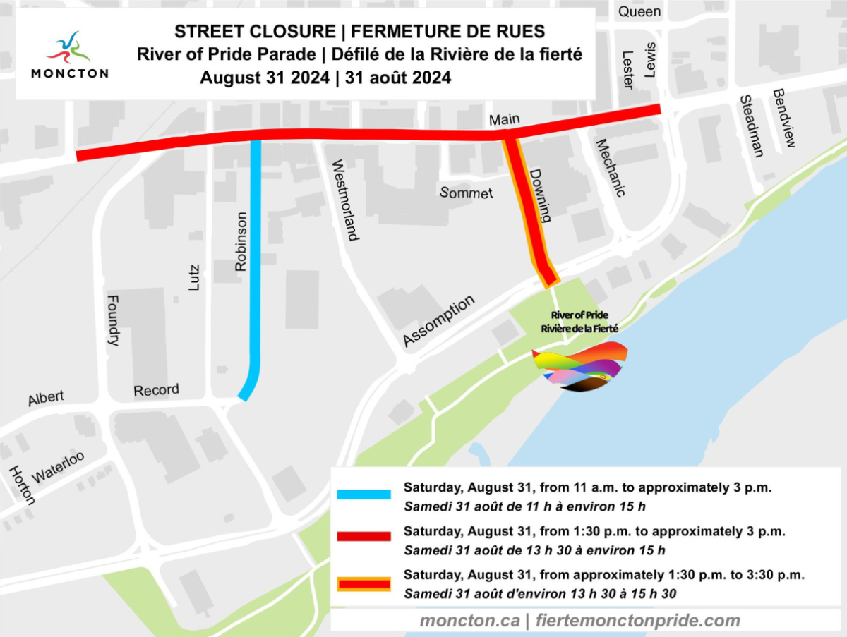 Fermetures de rues pour le défilé de la Rivière de la fierté Image Lieu : Les rues Main, Robinson et Downing Date de l’événement : Le samedi 31 août Répercussion sur la circulation :Le samedi 31 août de 11 h à environ 15 h : fermeture complète de la rue Robinson, entre les rues Main et RecordLe samedi 31 août de 13 h 30 à environ 15 h : fermeture complète de la rue Main, entre les rues Bonaccord et LewisLe samedi 31 août d’environ 13 h 30 à 15 h 30 : fermeture complète de la rue Downing, entre la rue Main et le boulevard Assomption Détails de l’événement : Rivière de la Fierté